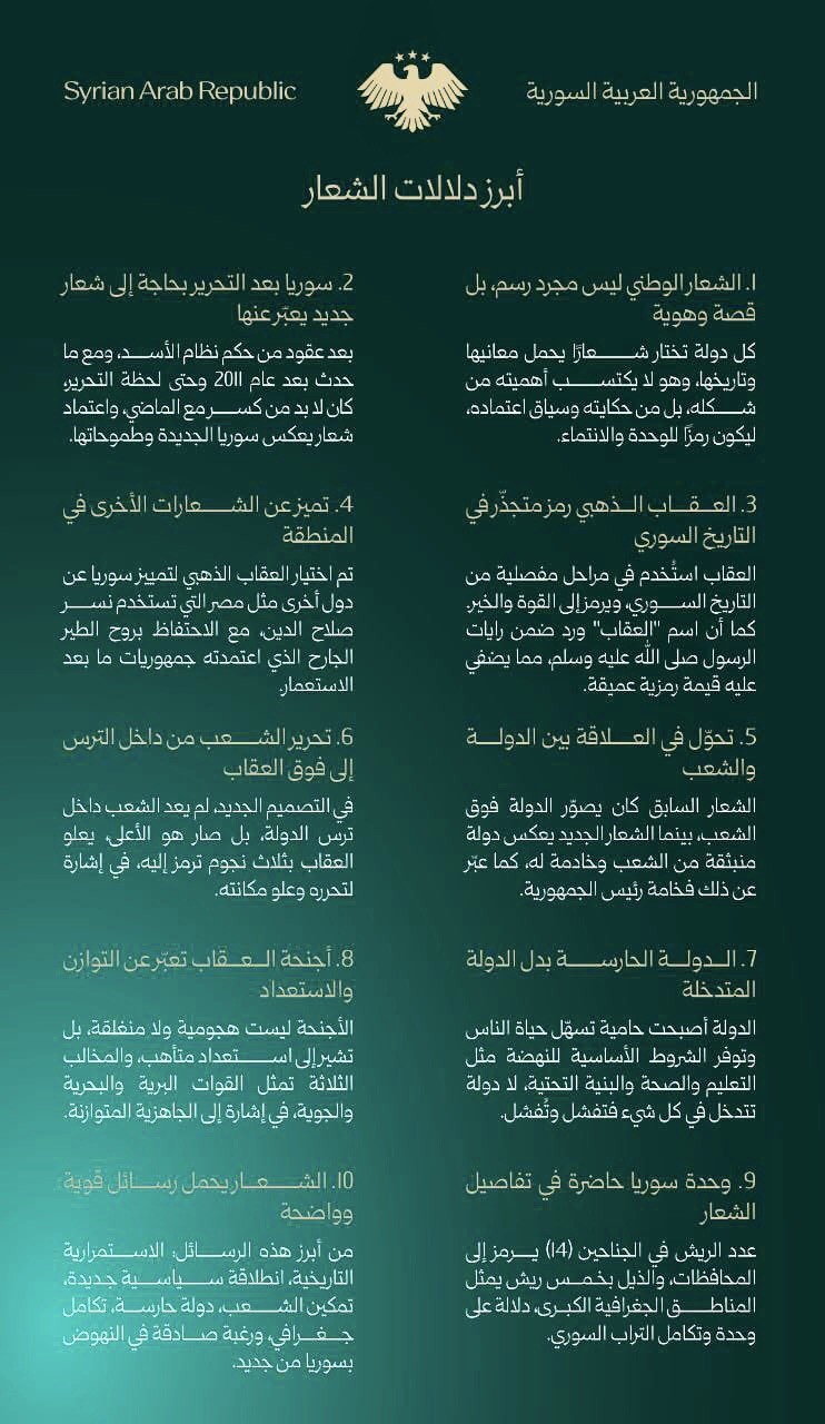 في حين أبدى آخرون اهتمامًا بالمعاني الرمزية الكامنة خلف اعتماد العُقاب والنجمات الثلاث، وما تحمله من دلالات على تاريخ سوريا وتطلعاتها المستقبلية .