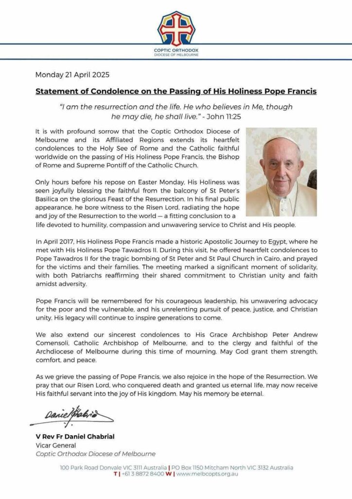 أصدرت إيبارشية ملبورن وتوابعها بأستراليا بيان لها ناهية فيه نياحة البابا فرنسيس بابا روما ، جاء فيه ما يلي ، ” ببالغ الحزن والأسى ، تتقدم إيبارشية ملبورن القبطية الأرثوذكسية والمناطق التابعة لها بتعازيها القلبية إلى الكرسي الرسولي في روما والمؤمنين الكاثوليك في جميع أنحاء العالم بوفاة قداسة البابا فرنسيس ، بابا روما والحبر الأعظم للكنيسة الكاثوليكية، وأضاف البيان بأنه قبل ساعات قليلة من رحيله يوم اثنين الفصح ، شوهد قداسته وهو يبارك المؤمنين بفرح من شرفة كاتدرائية القديس بطرس في عيد القيامة المجيد ، في ظهوره العلني الأخير شهد للرب القائم من بين الأموات، ناشراً رجاء وفرح القيامة للعالم ، خاتمة مناسبة لحياة كرست للتواضع والرحمة والخدمة الدؤوبة للمسيح وشعبه ، كما أشار البيان بأن قام قداسة البابا فرنسيس بزيارة رسولية تاريخية إلى مصر في أبريل 2017 ، حيث التقى بقداسة البابا تواضروس الثاني قدم خلال الزيارة تعازيه الحارة للبابا تواضروس الثاني في ضحايا التفجير الإرهابي المأساوي الذي استهدف كنيسة القديسين بطرس وبولس في القاهرة ، وصلى من أجل الضحايا وعائلاتهم ، وشكل اللقاء لحظة تضامن فارقة ، حيث أكد البطريركان التزامهما المشترك بوحدة المسيحيين وإيمانهم في خضم الشدائد ، وسيذكر البابا فرنسيس لقيادته الشجاعة، ودفاعه الدؤوب عن الفقراء والمستضعفين ، وسعيه الدؤوب لتحقيق السلام والعدالة والوحدة المسيحية. سيظل إرثه مصدر إلهام للأجيال القادمة ، وأختتم البيان بتقديم أحر التعازى إلى صاحب النيافة المطران بيتر أندرو كومنسولي، رئيس أساقفة ملبورن الكاثوليكي ، وإلى رجال الدين والمؤمنين في إيبارشية ملبورن في هذا المصاب الجلل ، نسأل الله أن يمنحهم القوة والراحة والسلام ، بينما نحزن على رحيل البابا فرنسيس، نبتهج أيضاً برجاء القيامة ، ندعو الله القائم من بين الأموات، الذي غلب الموت ومنحنا الحياة الأبدية، أن يتقبل خادمه الأمين في فرح ملكوته. فلتكن ذكراه خالدة .