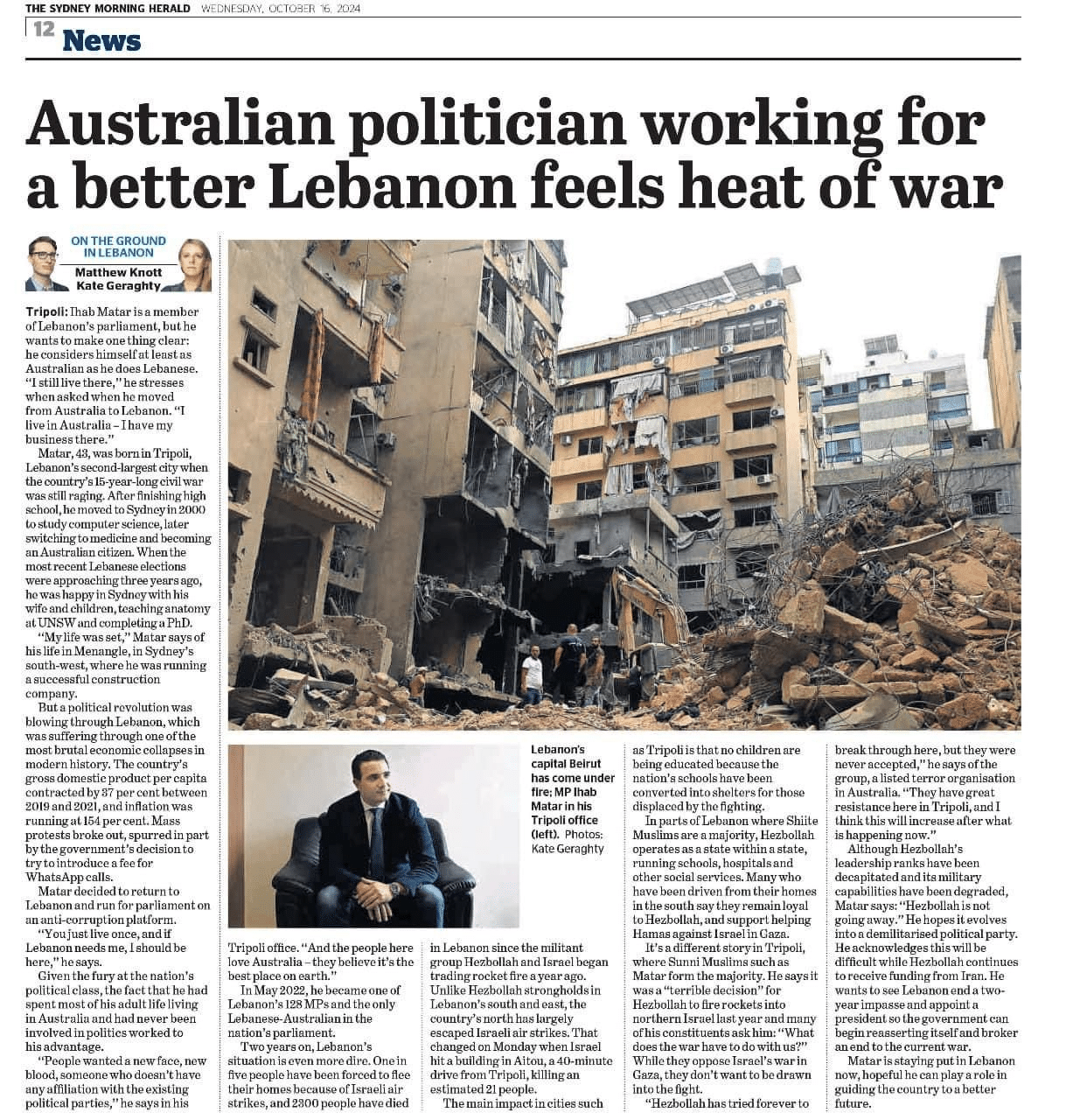إيهاب مطر السياسي اللبناني – الأسترالي يعمل من أجل لبنان أفضل رغم سخونة الحرب