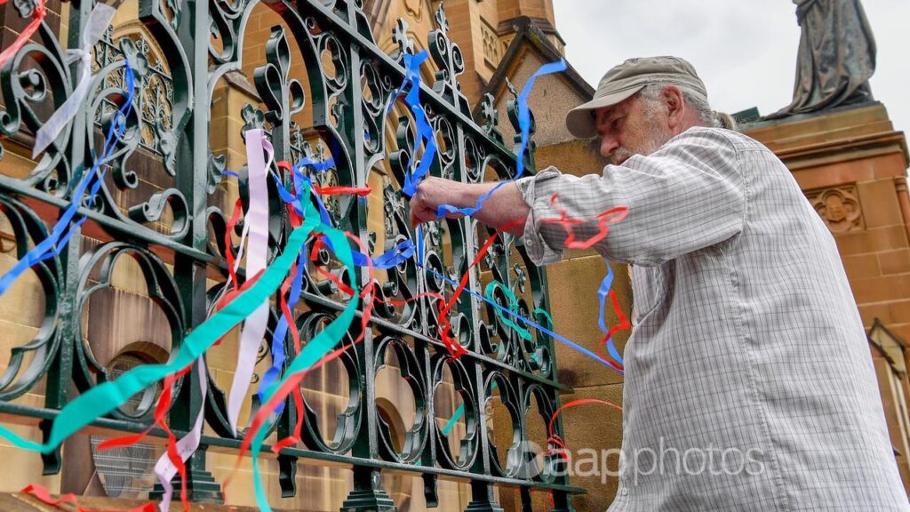 Paul Auchettl, whose brother was a victim of clerical abuse by a priest under the leadership of Cardinal Pell in Ballarat during the 1970s, is vowing to continue tying memorial ribbons to the fence.