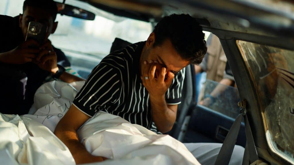 A mourner reacts over the body of a Palestinian killed in an Israeli strike on an area designated for displaced people, during a funeral in Rafah in the southern Gaza Strip, 27 May 2024 (Reuters/Mohammed Salem)