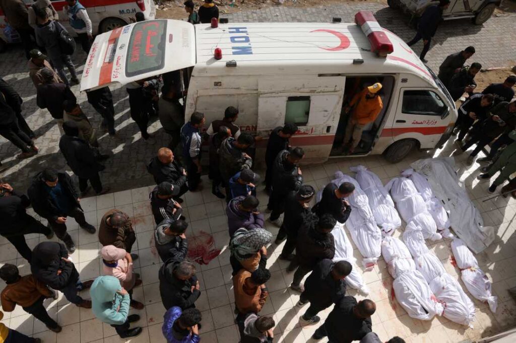 Palestinians recite a prayer over the bodies of victims of Israeli overnight airstrikes in the northern Gaza Strip, in front of the Indonesian Hospital in Beit Lahia on Thursday. Bashar Taleb/AFP