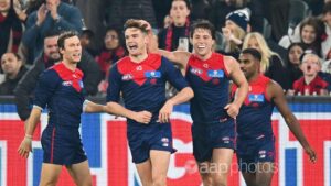 Bayley Fritsch’s likely AFL goal of the year has helped Melbourne secure a gritty eight-point win, ending Geelong’s perfect start