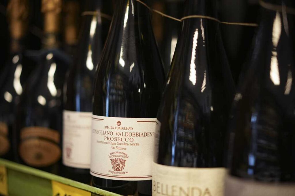 Bottles of Prosecco are lined up on a shelf of a wine shop in Rome last month. Trump’s threatened 200% tariffs, if they go into effect, could impact products like imported Prosecco, French champagne and Spanish wine. Andrew Medichini/AP